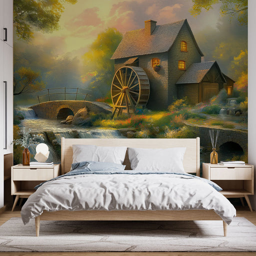 WonderMuralTablomuzda bir resimli su değirmeni bulunmaktadır, altın rengi gün batımının aydınlattığı, yeşil ve huzur verici bir manzara ile çevrilidir. Akarsu...