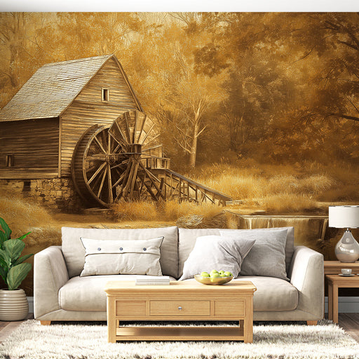 WonderMuralBu büyüleyici duvar resmi kağıdı, sonbaharın sıcak güzelliğini çağrıştıran altın yapraklarla çevrili bir su değirmeni tasvirini içeriyor. Değirmeni...