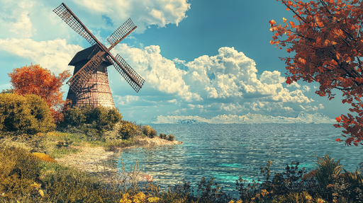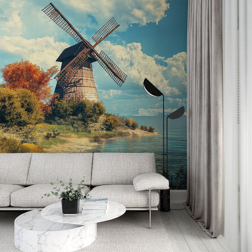 WonderMuralBu büyüleyici duvar resmi, su kenarında görkemli bir şekilde duran geleneksel bir değirmeni, renkli bitki örtüsü ve uzak dağları göstermektedir. Ağ...