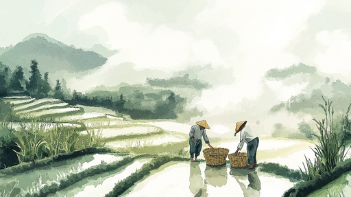 Tüm ayrıntıları görüntüleFototapet pirinç tarlaları | Pirinç tarlalarının ve işçilerin sanatsal illüstrasyonları