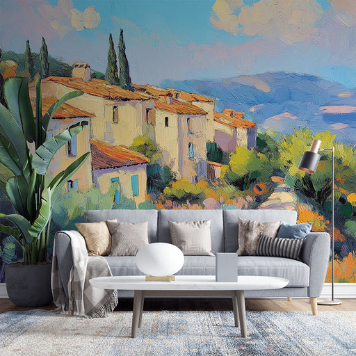 WonderMuralBu duvar resmi, canlı bir Provençal manzarasını çağrıştırır, pastel renkli cepheli evler ve kırmızı kiremitli çatılarla çevrili canlı doğa. Lavanta...