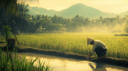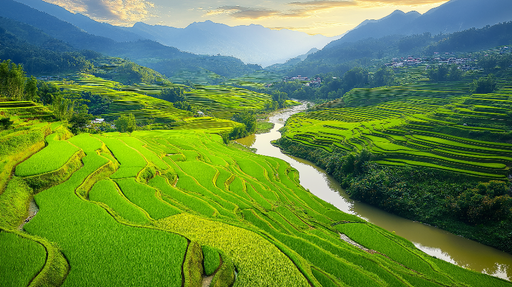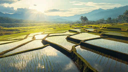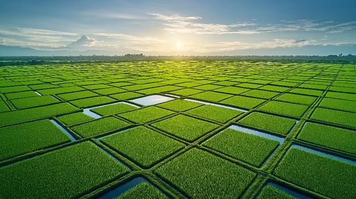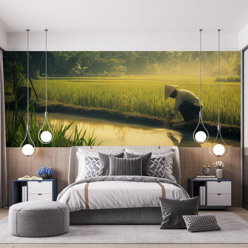 WonderMuralBu canlı duvar resmi, genç pirinç sürgünlerinin parıldayan suyun üzerinde yücelerek doğal güzelliğini yakalar. Alanı aydınlatan batan güneş, herha...