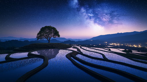 Tüm ayrıntıları görüntüleFototapet pirinç tarlaları | Yıldızlı bir gökyüzü altında aydınlatılan pirinç tarlaları