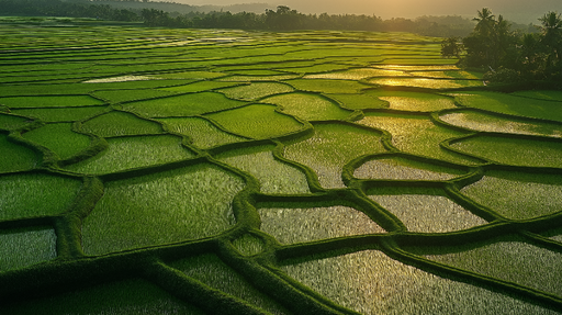 Tüm ayrıntıları görüntüleFototapet pirinç tarlası | Genç pirinç filizleri batan güneşin altında parladı