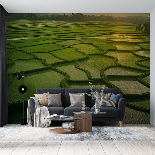 WonderMuralBu Duvar Resmi, muhteşem bir günbatımının altında parlayan yeşil pirinç tarlalarının manzarasını resmediyor. Pirinç tarlalarının canlı yeşil tonlar...