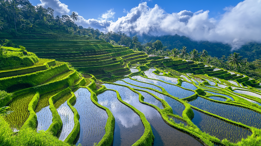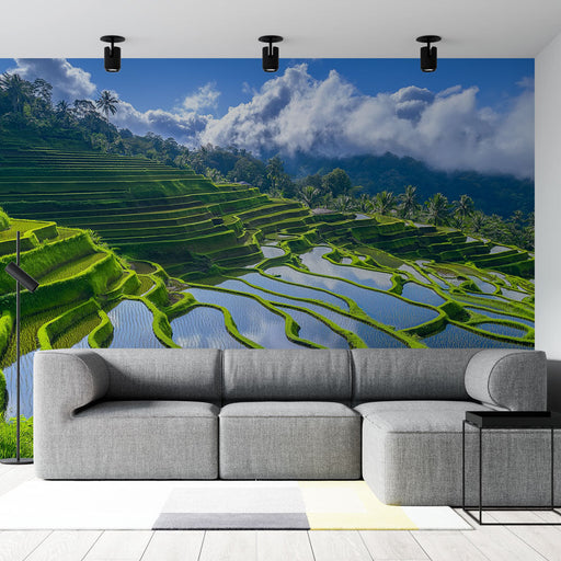 WonderMuralBu duvar resmi, canlı yeşil tarlaların suyun gökyüzünü yansıttığı muhteşem teraslı pirinç tarlalarını sergiliyor. Dalgalı sıralar hareket ve doğa i...