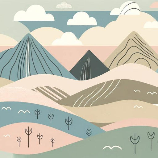 Baby PrintBu Bebek dağ manzaralı duvar kağıdı , yumuşak pastel tonları ve stilize geometrik şekilleriyle, çocuk odasına bir dokunuş fantastiklik ve tatlılık...