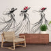 Bu Fotoğraf Duvar Kağıdı, kırmızı güllerle süslenmiş şapka takan kadınların zarif siluetlerini içeriyor. Akıcı siyah çizgiler, hareket ve zarafet atmosferi yaratırken, mekânınıza sanatsal bir dokunuş sunar.